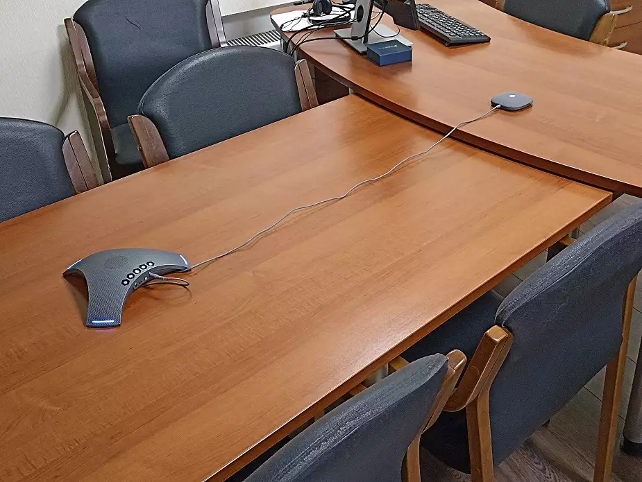 Три встроенных микрофона и один выносной микрофон обеспечивают всенаправленный приём голоса на 360° с дальностью до 8 метров, что позволяет участникам перемещаться по комнате без потери качества передачи речи.